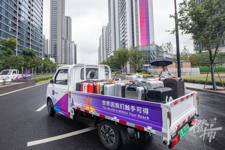 在他们的接驳车之后,还会跟着一辆行李接驳车,这也是一项贴心的细节服务,这样一来大家都不用托着行李坐接驳车,行李也会一路送到住地。