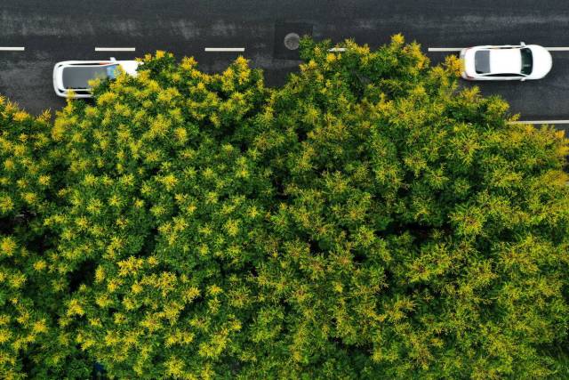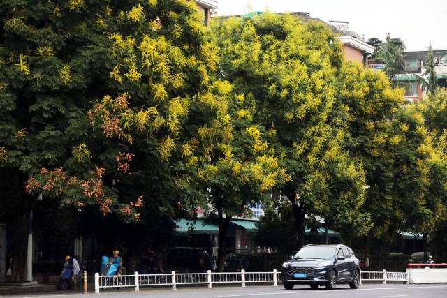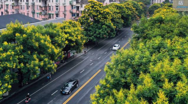 黄山栾树是近年来杭城栽种较多的优质行道树种之一,每年夏末秋初时节开花结蒴,色彩由黄变橙至褐,营造起一道可延续3个月的渐变秋色。