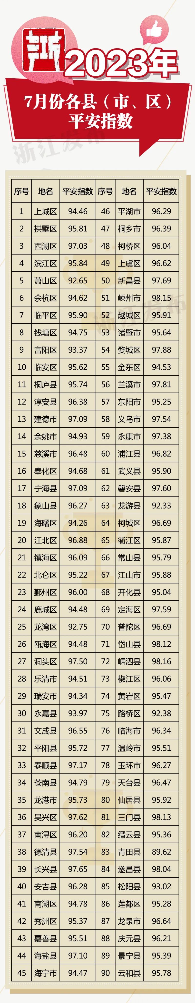 平安浙江指数是衡量浙江省平安建设状况各项客观指标的综合相对数,共有8个一级指标、19个二级指标、123个三级指标,包括社会政治安全、社会治安安全、经济金融安全、生产安全、食品药品安全、生态环境安全、网络与信息安全,以及社会稳定、刑事安全、治安安全、有效火警接警数、道路交通万车事故死亡率等指标。