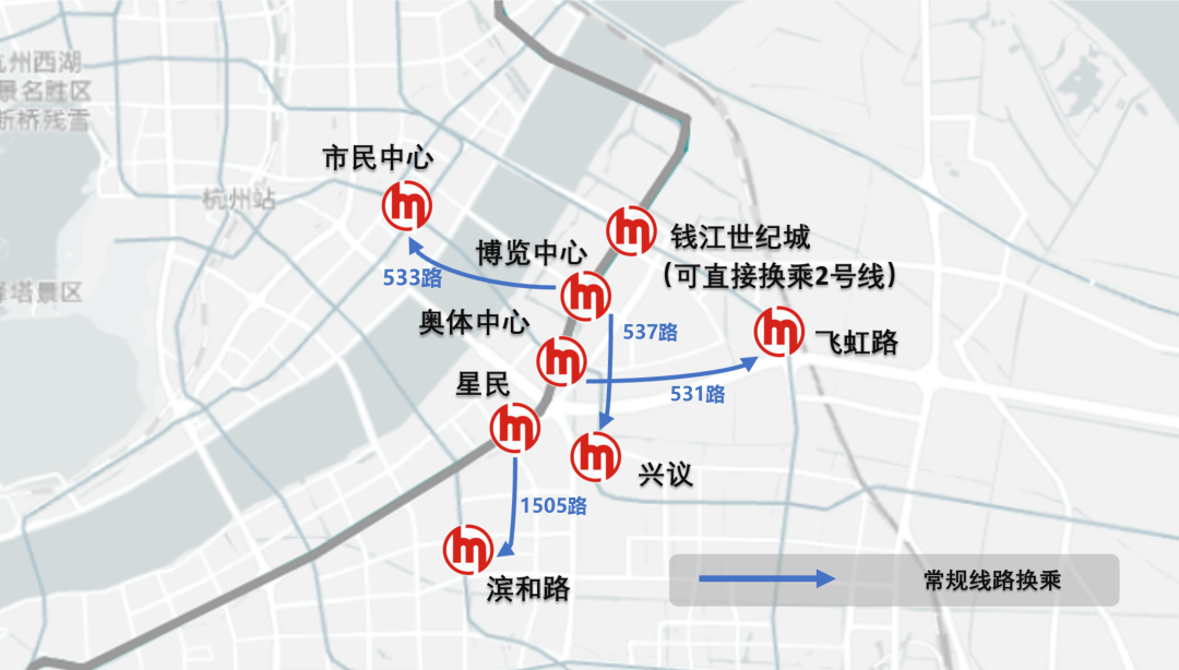 星民、奥体中心、钱江世纪城3站可通过周边常规公交换乘地铁。