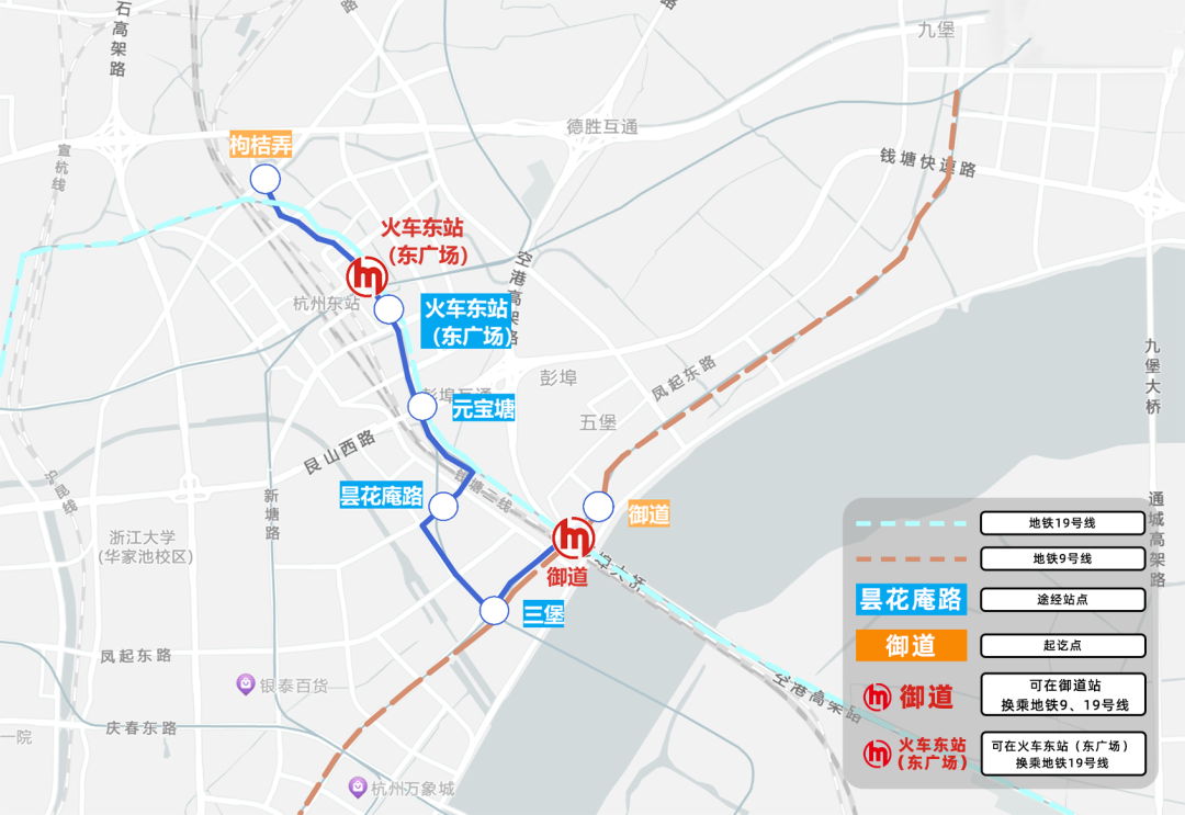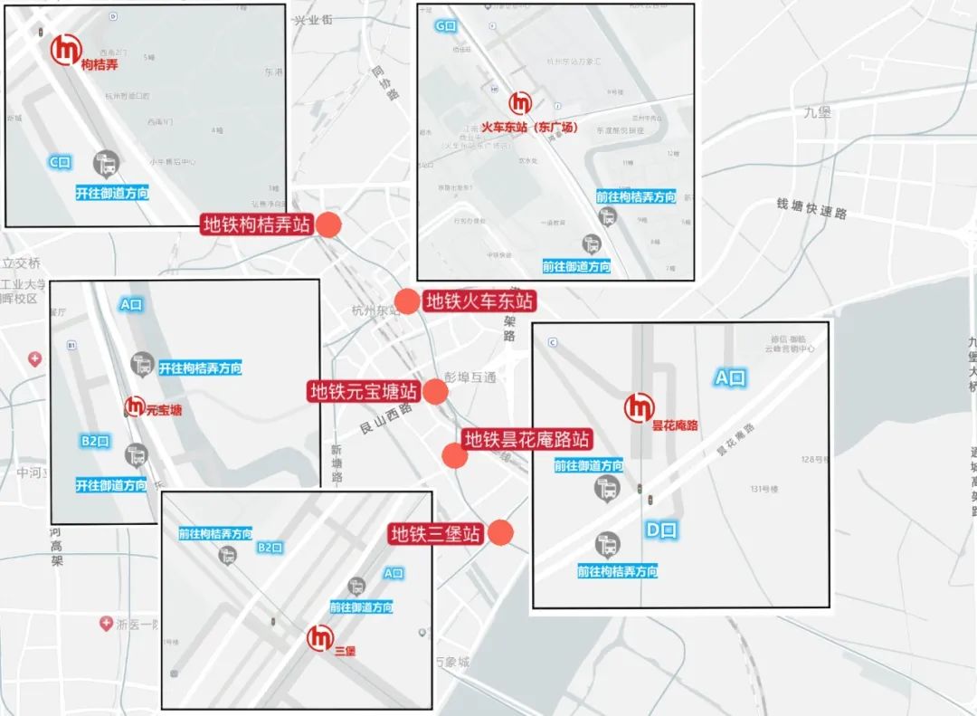 三堡、昙花庵路、元宝塘、火车东站(东广场)、枸桔弄
