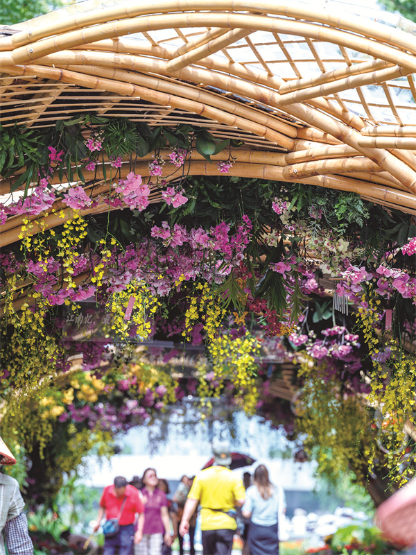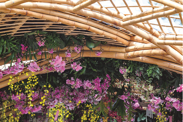 绕过“巨型松果”,一处宋韵竹廊掩映于花丛中,这就是“友谊花廊”。行走于竹廊中,阳光从竹子的缝隙中点点倾泻,代表亚洲地域特色的花卉夹道相迎,蝴蝶兰、万代兰、石斛兰、文心兰等兰科花卉和空气凤梨、鹿角蕨等特色植物悬挂于竹廊内。