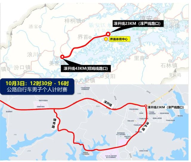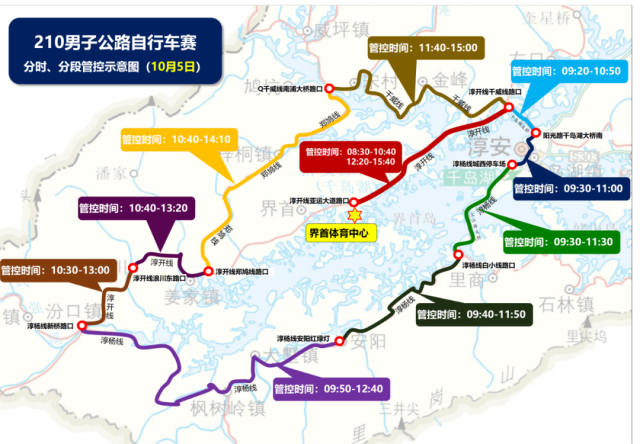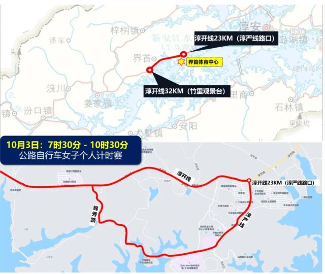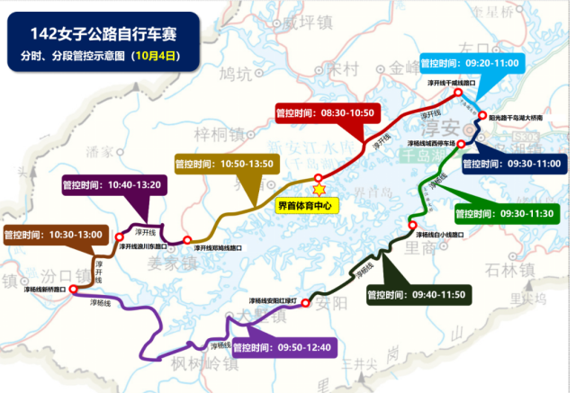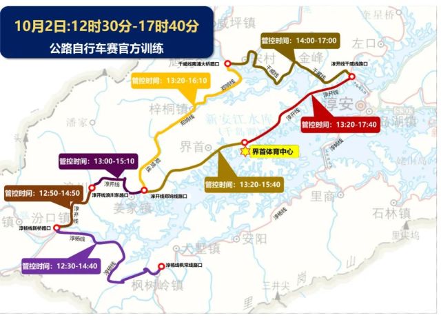 八、10月3日7时30分至10时30分,公路自行车女子个人计时赛期间,界首体育中心锦秀路、淳严线、淳开线23kM(淳严线路口)至32kM(竹里观景平台)实施交通管控。