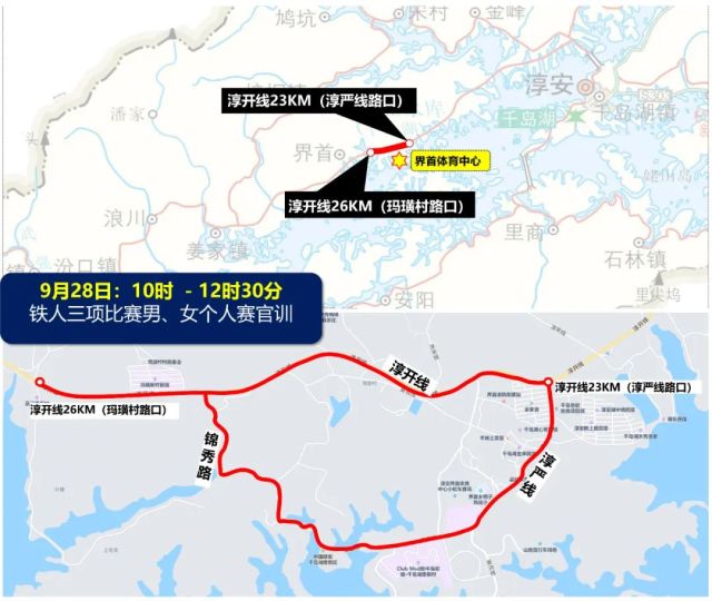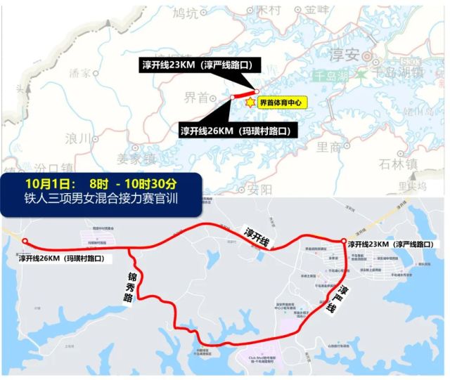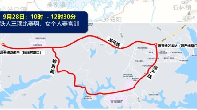 二、9月28日10时至12时30分,铁人三项比赛男、女个人赛官方训练期间,界首体育中心锦秀路、淳严线、淳开线23KM(淳严线路口)至26KM(玛璜村路口)路段实施交通管控。