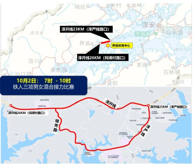 六、10月2日7时至10时,铁人三项男女混合接力比赛期间,界首体育中心锦秀路、淳严线、淳开线23KM(淳严线路口)至26KM(玛璜村路口)路段实施交通管控。