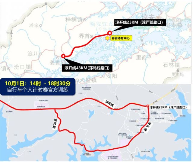 10月1日14时至18时30分,公路自行车个人计时赛官方训练期间,界首体育中心锦秀路、淳严线、淳开线23KM(淳严线路口)至43KM(郑鸠线路口)路段实施交通管控。