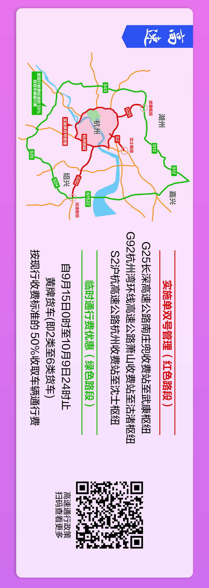 9月16日至10月9日的每日7时至20时,G25长深高速公路南庄兜收费站至武康枢纽、G92杭州湾环线高速公路萧山收费站至沽渚枢纽、S2沪杭高速公路杭州收费站至沈士枢纽禁止危险化学品运输车通行。