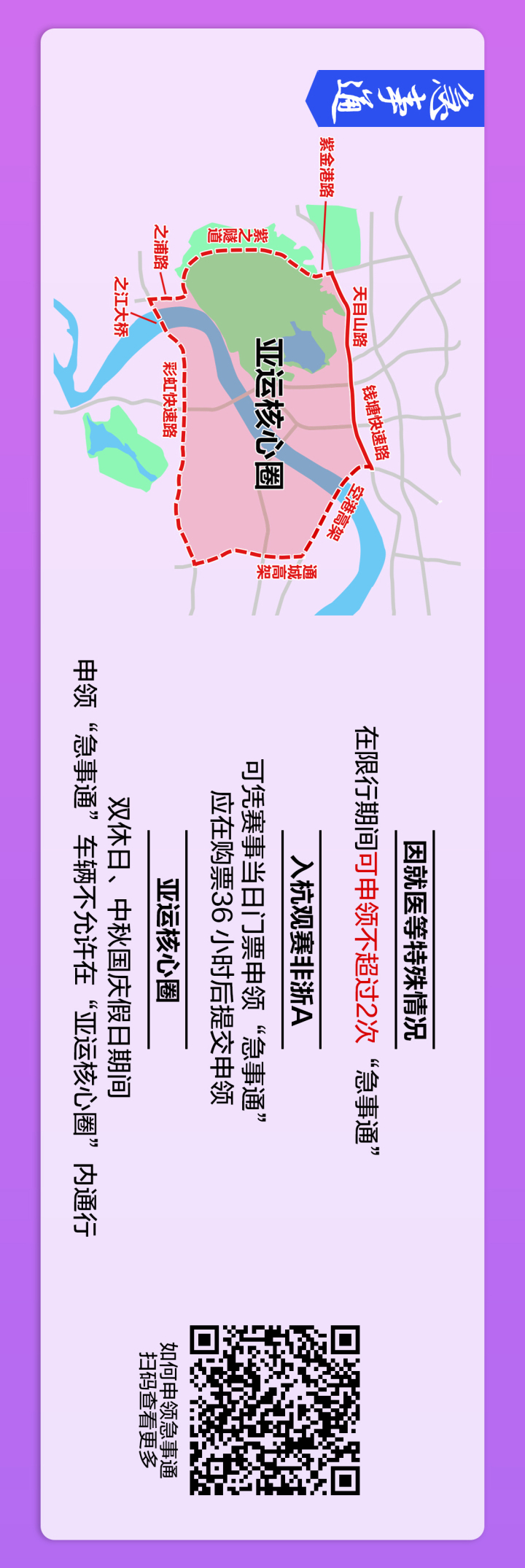 “急事通”旨在为方便亚运期间因就医等特殊情况确需进入杭州市区限行区域内通行需要,是亚运期间的便民措施,建议广大交通参与者按需提出申请。