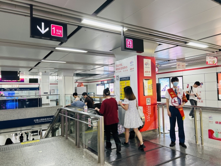 7点56分,丁女士乘坐5号线到达打铁关站,发现站台上的站务人员增加了不少,在换乘通道处也有不少工作人员维持秩序。