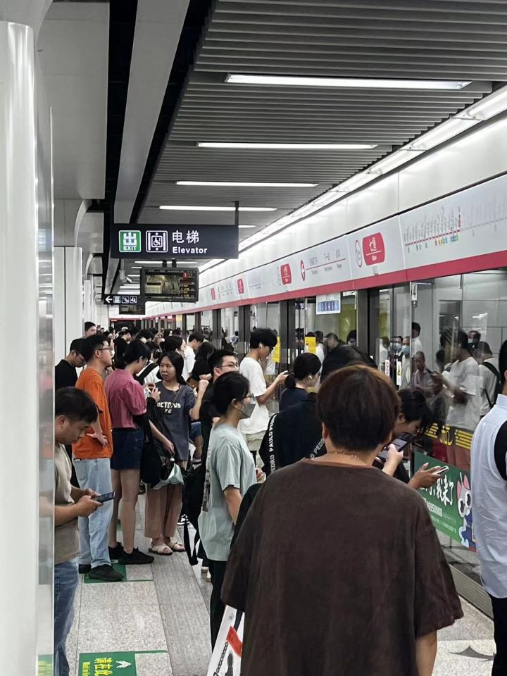 8点20,在地铁1号线七堡站,站台上人比以往多了不少,尤其是往湘湖方向站满了。根据显示屏可以看到,班次间隔已经在1分半左右,基本达到极限。