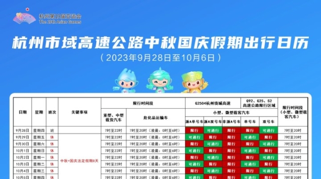 此外,“双节”期间,杭州市行政区域内主要涉及G2504杭州绕城高速、G25长深高速(杭宁高速)、G92杭州湾环线(杭甬高速)、S2沪杭高速等路段采取交通管理和服务保障措施。