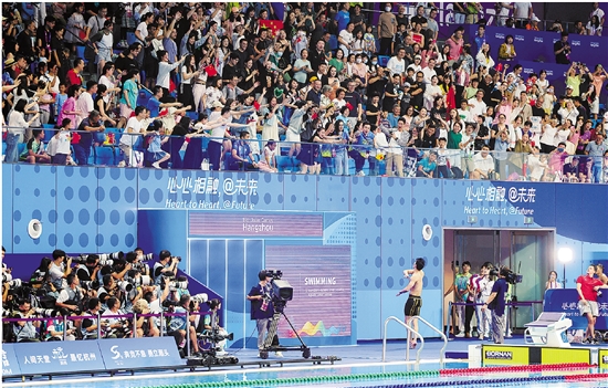 9月29日,徐嘉余获得杭州亚运会男子200米仰泳冠军后,将泳帽抛向观众,感谢粉丝的支持。记者 李震宇 摄