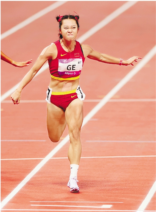 9月30日,杭州第19届亚运会田径女子100米决赛,中国选手葛曼棋夺得金牌。记者 王建龙 摄