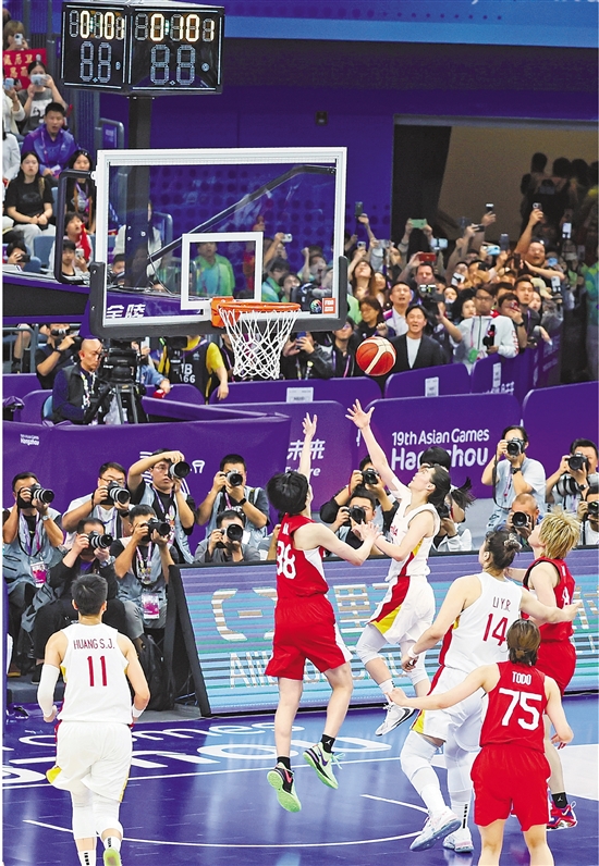 10月5日晚,杭州亚运会女篮决赛,凭借着王思雨在终场前9秒的突破绝杀,中国女篮74比72战胜日本女篮,成功卫冕亚运会女篮冠军。记者 姚颖康 摄