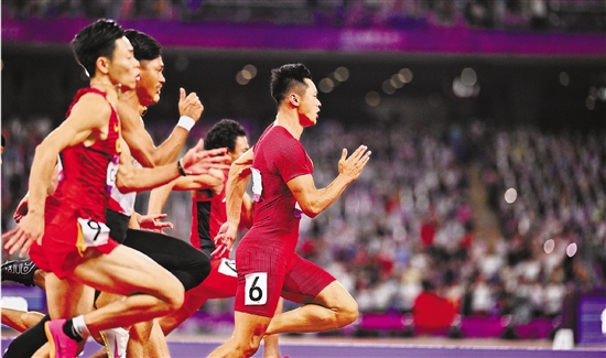 9月30日晚,在万众瞩目的杭州亚运会男子100米决赛中,中国选手谢震业以9秒97的成绩夺冠。记者 董旭明 摄