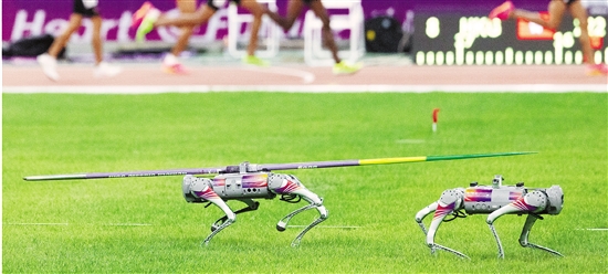 “您好,您的标枪已送达!”10月4日,浙江杭州。在亚运会田径赛场上,两只科技感满满的“机器狗”在赛场上运送标枪。记者 李震宇 摄