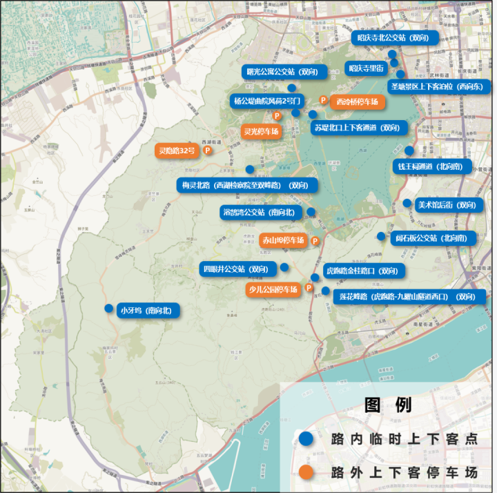 在西湖北线设置西泠桥停车场、灵光停车场、灵隐路32号,西湖南线设置赤山埠停车场、少儿公园停车场临时上下客点等5处出租车、网约车集中上下客服务点,为司机和游客提供集中服务。