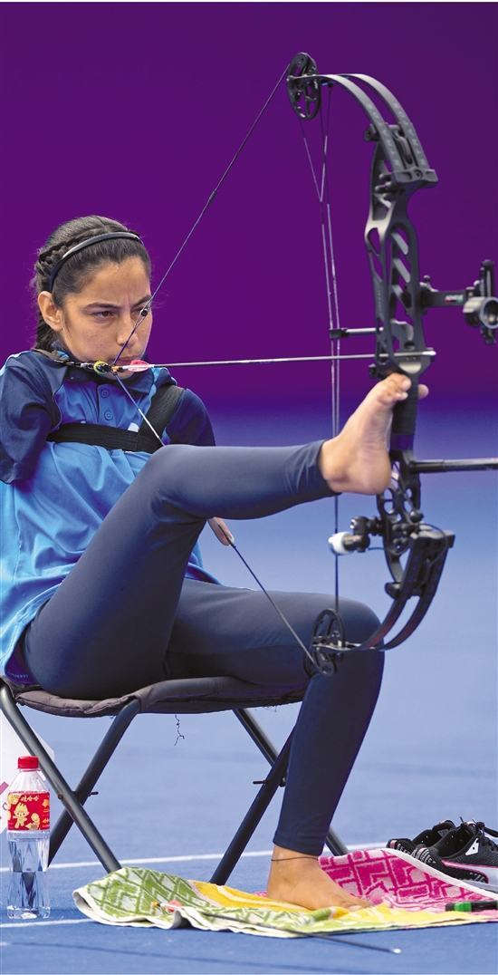 印度射箭女运动员西塔尔用脚开弓射箭,赢得金牌。记者 倪雁强 摄