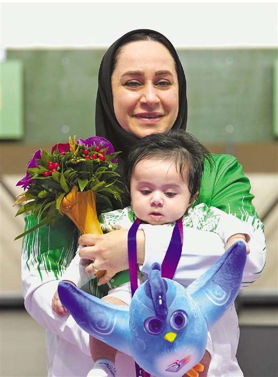 伊朗射击运动员萨雷赫·贾万马尔迪抱着宝宝上台领奖。 本报记者 马赛洁 摄