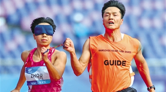 在女子100米T11比赛中,周国华(左)在领跑员贾登璞的协助下完成比赛。 本报记者 董旭明 摄