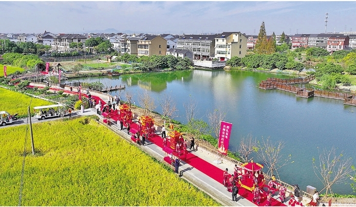 坐上大花轿、走过合欢桥、同跨红火缸、共乘幸福船……近日,一场“良缘水乡缔 佳偶自天成”水乡集体婚礼在临平塘栖镇丁河村举行,八对新人在村民和游客的见证下喜结良缘,并发出《婚俗改革倡议书》,向广大适婚青年传播新时代的恋爱婚姻观,倡导健康文明的嫁娶新风尚。