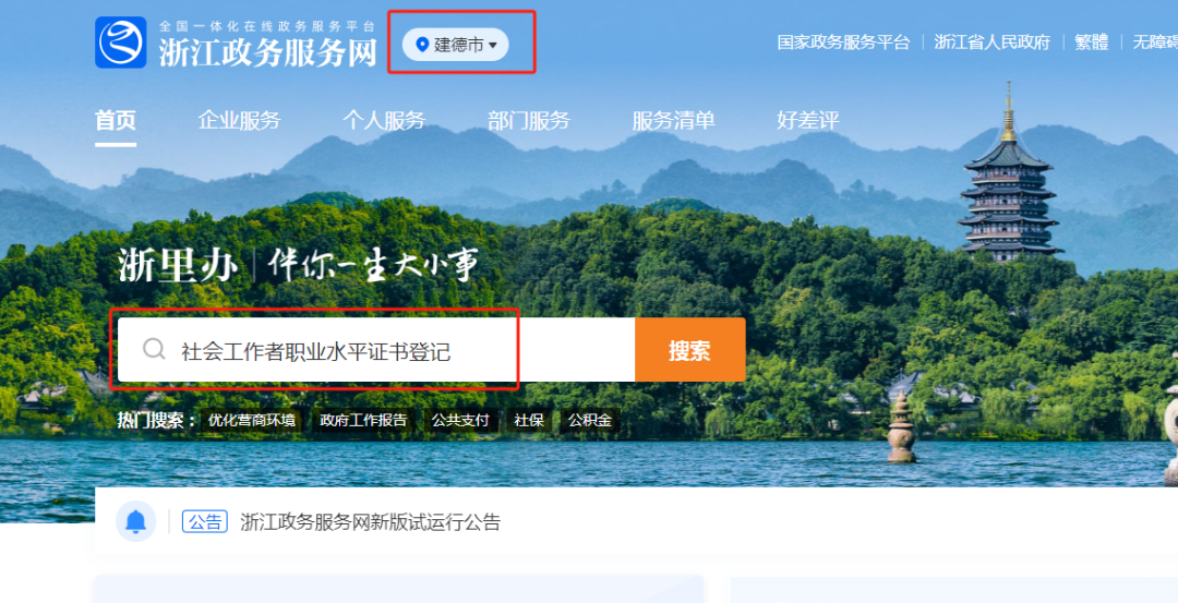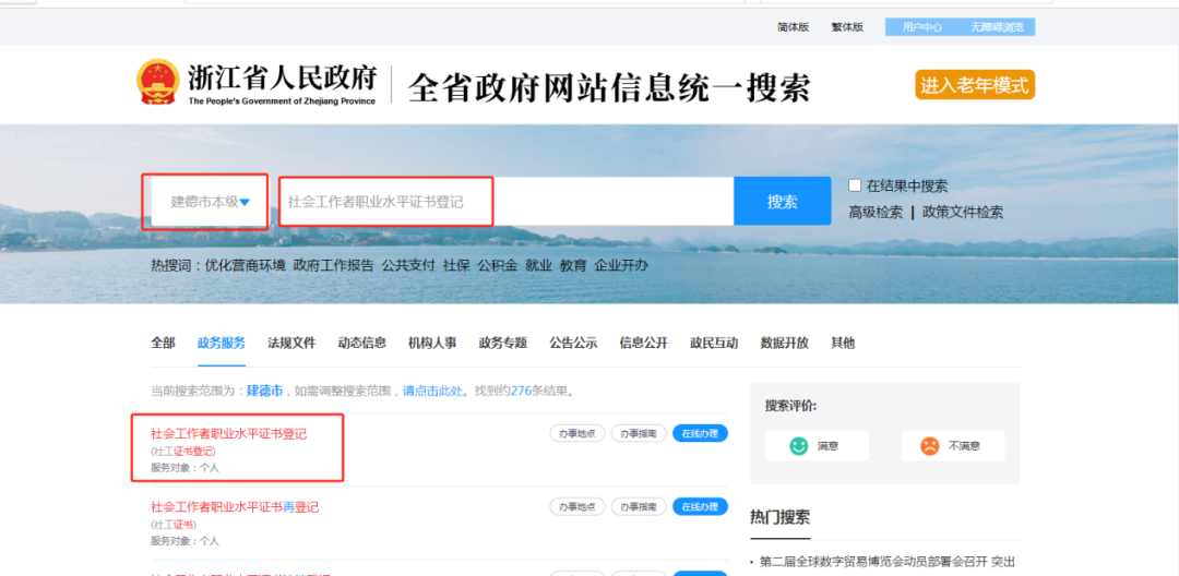 登录移动端“浙里办”APP,搜索“社会工作者职业水平证书登记”服务,选择“建德市民政局”的在线办理入口进行登记。