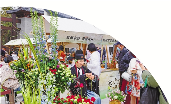 在德寿宫遗址博物馆首场市集“宋韵·国风礼市”上,摊主向游客展示插花技艺。 记者 吕之遥 摄