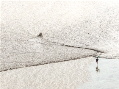 远远地,出现了一条白线,那就是潮水来了。远远看到,“赶潮人”就像一个个小黑点,跟着潮水移动。