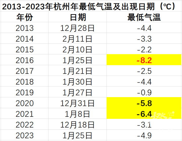 但是目前还只是12月中旬,时间节点偏早。杭州的最冷时段通常都是1月-2月上旬,12月下旬也有可能,基本上一年中的最低气温也大都出现在这些时段。2013年以来,也就去年(2022年)12月中旬(18日)出现了一次年最低气温-3.1℃!