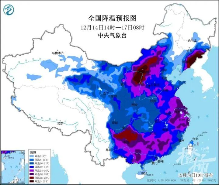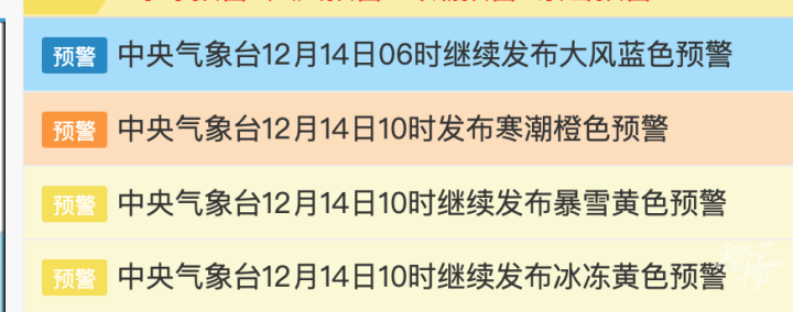 中央气象台今早10时已将寒潮预警信号升级为最高级别的橙色:受强寒潮影响,预计,12月14日14时至12月17日08时,我国大部地区将自西向东、自北向南先后降温8~12℃,其中,陕西中北部、山西北部和西部、内蒙古中部、河北北部、北京西部、辽宁东部、吉林东南部、河南东部以及江南东部和南部、西南地区东南部、华南大部等地降温14~16℃,内蒙古中部、陕西北部、吉林东南部、辽宁东部部分地区降温超过20℃。上述大部地区伴有4~6级偏北风,阵风可达7~9级,局地超过10级,东部和南部海区有6~8级、阵风9~10级大风。