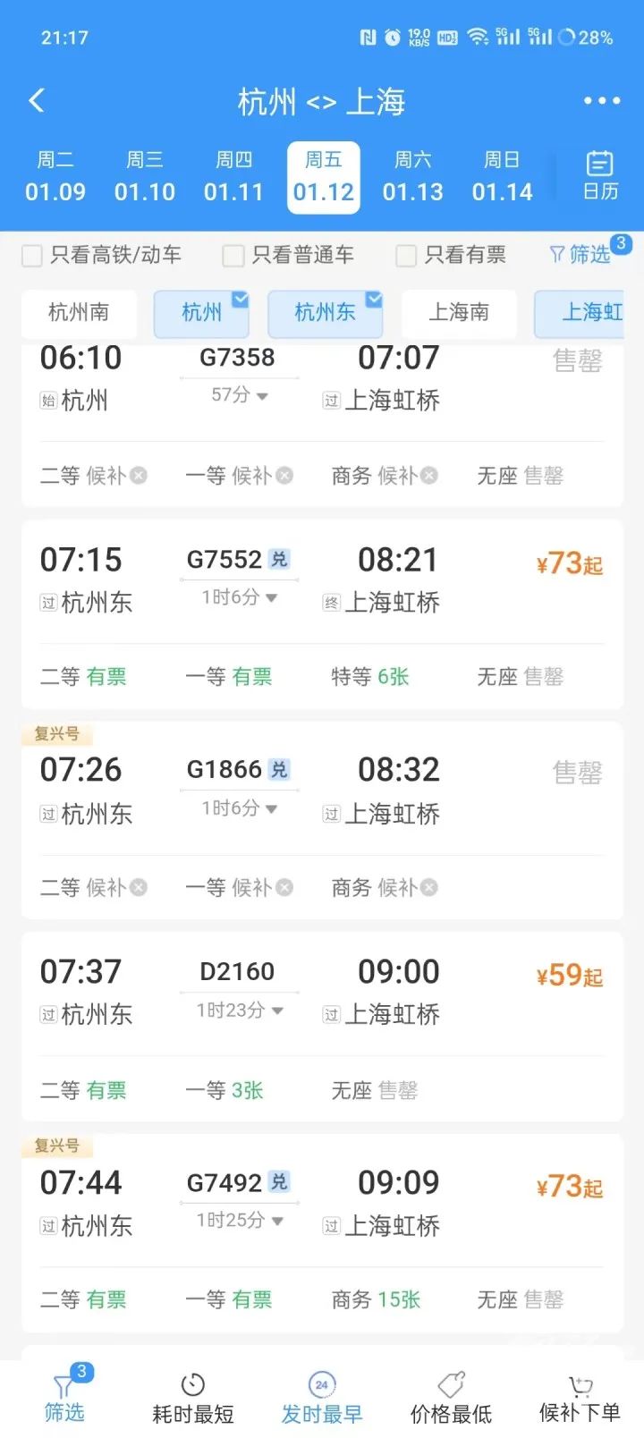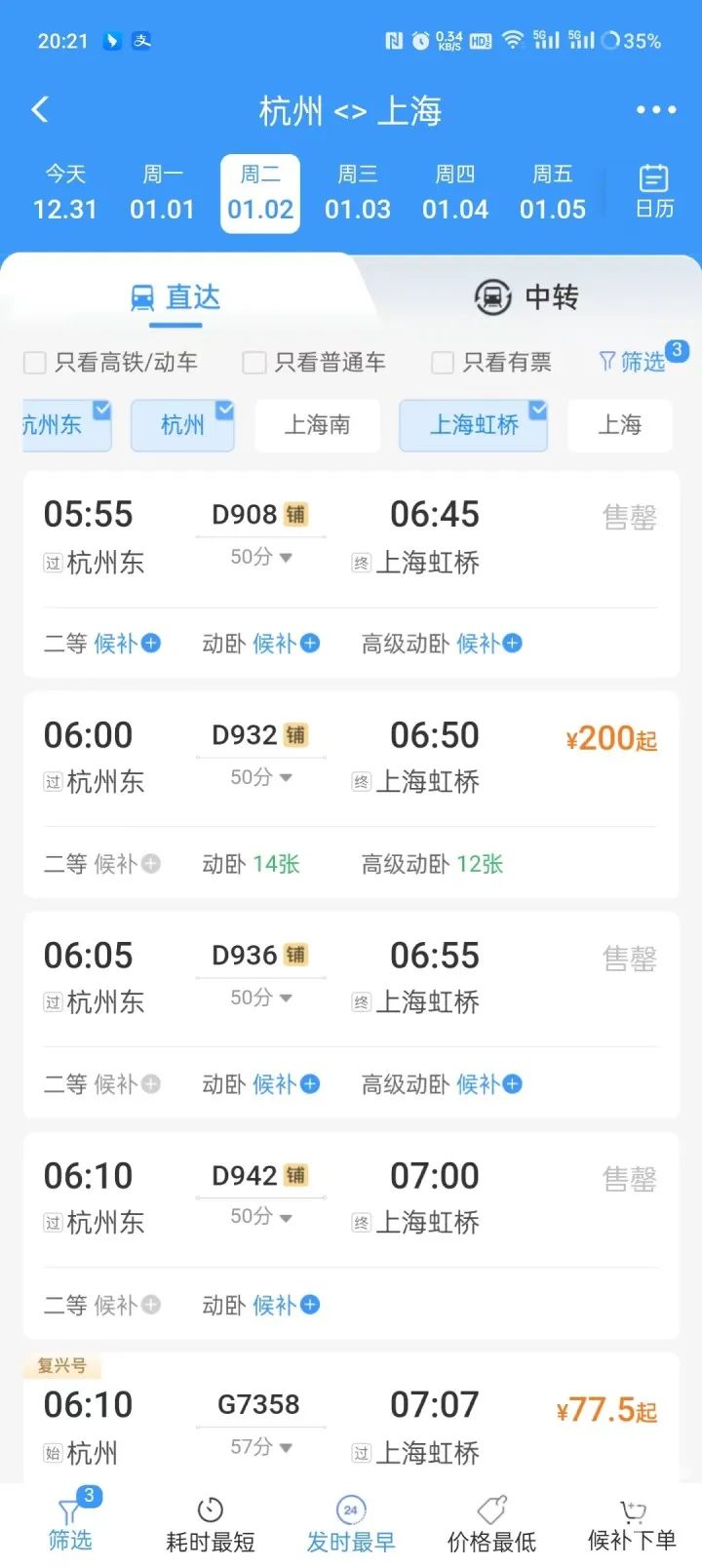 而接下来的第一个工作日,也就是本周二,杭州站与杭州东站到上海虹桥的5点55分-7点26分的动车高铁票全部售罄。