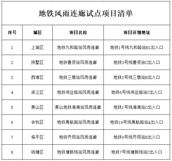 首批地铁风雨连廊共有8个试点项目,于2023年年初开始筹划,8月陆陆续续动工铺开试点,分布在上城、拱墅、西湖、滨江、萧山、钱塘、余杭、临平各区。其中,钱塘区的地铁7号线塘新线站与云帆未来社区相连通,其余都与最近的公交站点或非机动车停放区域相连,目前已全部完工。