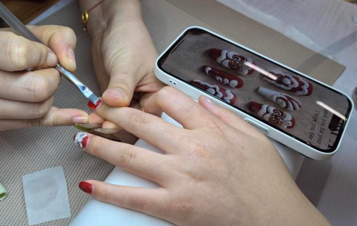 丹丹介绍称,每个顾客的喜好不一样,选择的“新年甲”也不尽相同。年轻顾客比较喜欢做红色美甲、每只手指画上不同花样,年龄稍微大一点的顾客则更偏好淡雅一点的素色、稍微装饰亮片和水钻。