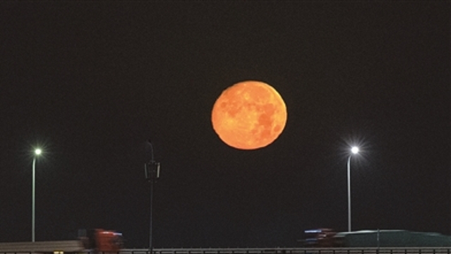昨天早上5:40,透过嘉绍大桥,杭州钱塘区方向的月亮。 记者 韩丹 摄