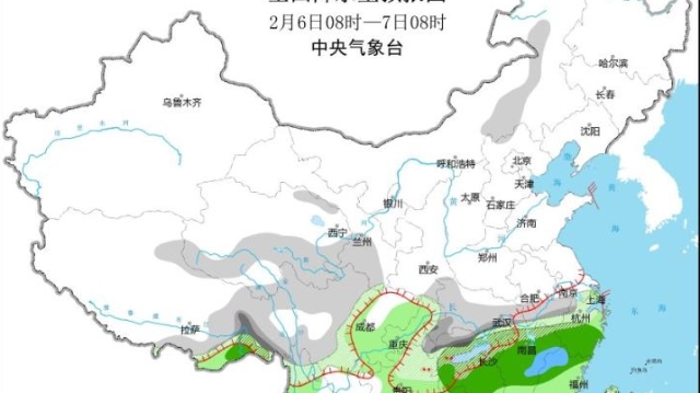 2月5日14时至6日14时,湖南北部、湖北南部、安徽南部等地有大雪(5至8毫米)。上述地区新增积雪深度2至5厘米。