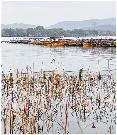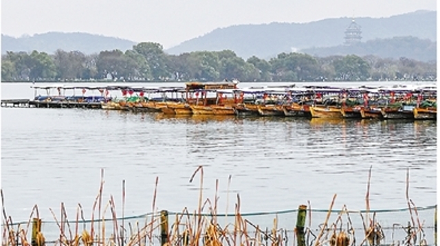 昨天,受雨雪天气影响,杭州西湖手划船停运。