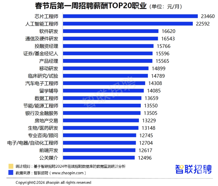 从职业看,高新技术岗位持续“霸榜”高薪榜单。其中,芯片工程师平均招聘薪酬达到23460元/月,排名第一。人工智能工程师以22592元的招聘月薪位居第二名。这两个职业薪酬排序与去年同期保持一致。此外,软件研发、通信及硬件研发、移动研发、生物/医药研发、前端开发等研发类岗位,继续保持招聘薪酬TOP 20成绩,印证了科技是第一生产力。