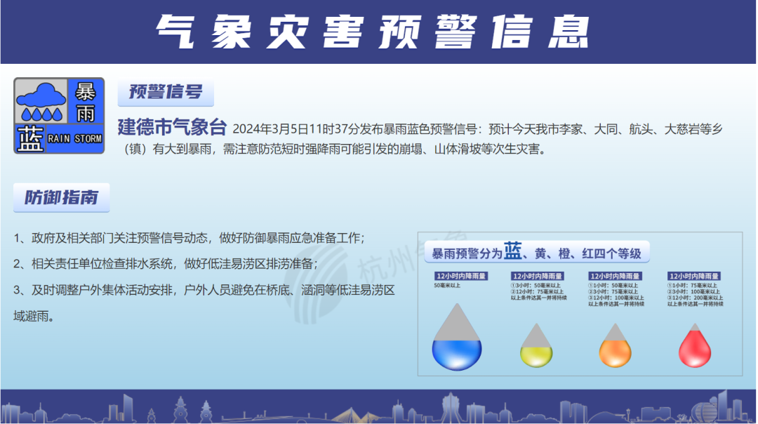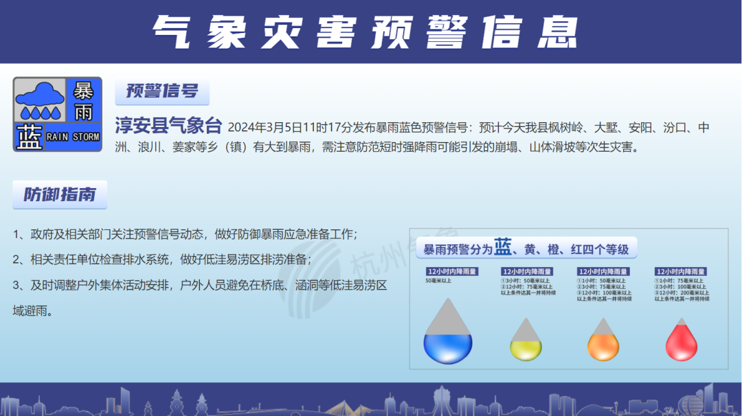 建德、淳安两地发布暴雨蓝色预警信号