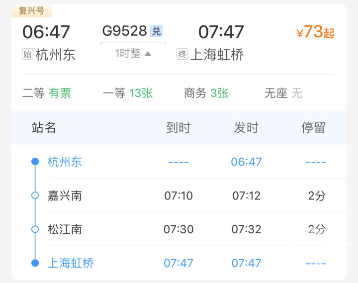除了晚间增开的列车,早晨时段从杭州往上海方向也增开了一列列车,是G9528次列车,6点47分从杭州东站发车,停靠嘉兴南站、松江南站,于7点47分到达上海虹桥站,全程耗时1小时,二等座票价73元。