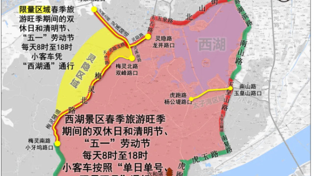 2.限行区域:北山街—环城西路—湖滨路—南山路—玉皇山路—玉皇山隧道—南复路—虎玉路—虎跑路—之江路—梅灵南路—梅灵隧道—梅灵北路—天竺路—灵隐支路—灵溪隧道—灵溪北路(马家坞以南)—灵溪南路—灵隐路—玉古路—玉泉路—灵隐路合围区域内的西湖景区道路。
