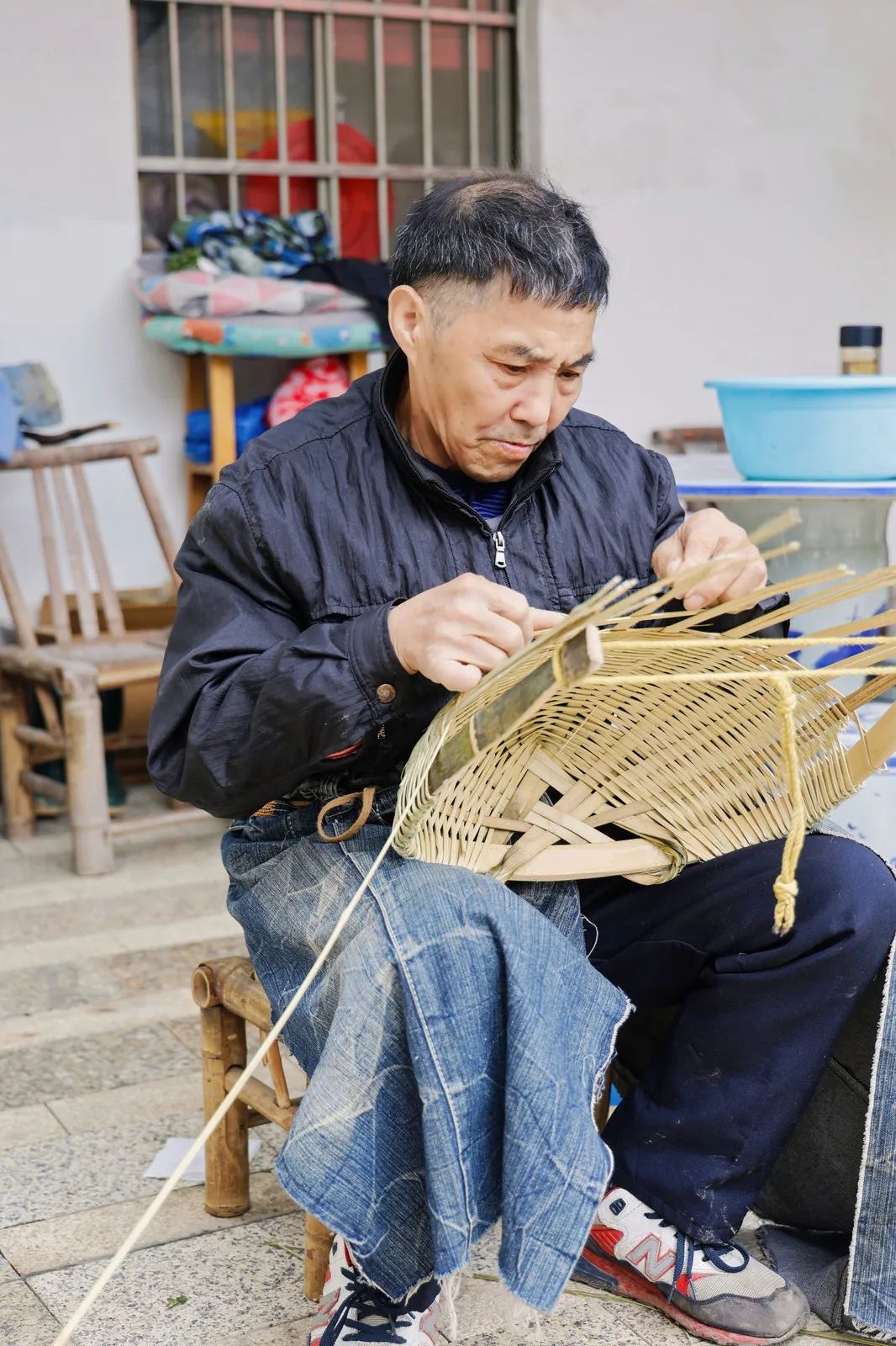 饭后,民间匠人们给孩子们变起了“竹子戏法”,只见他们的手指翻飞间,一根根细长的竹篾编织成了一体,竹篓、竹筐渐渐成型。