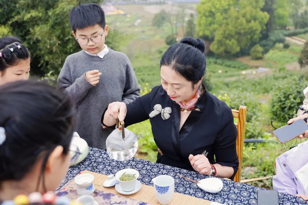 烫杯、温壶、洗茶、冲泡……杭州萧山楼塔镇素心茶楼的茶艺老师张冬英为孩子们带来了行云流水的茶艺表演。举手投足间,楼塔高山茶的香气逐渐升腾,深呼吸一口,沁人心脾。