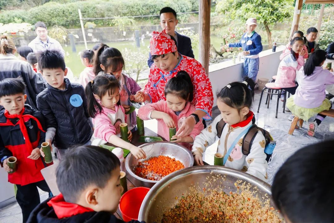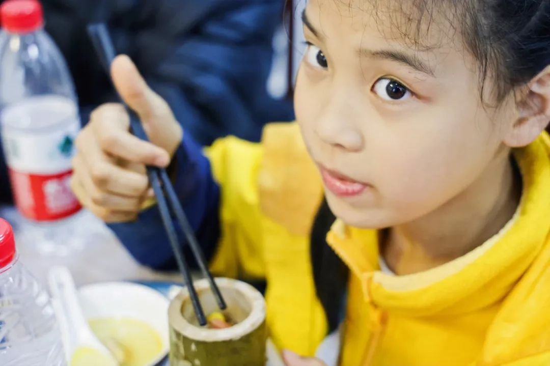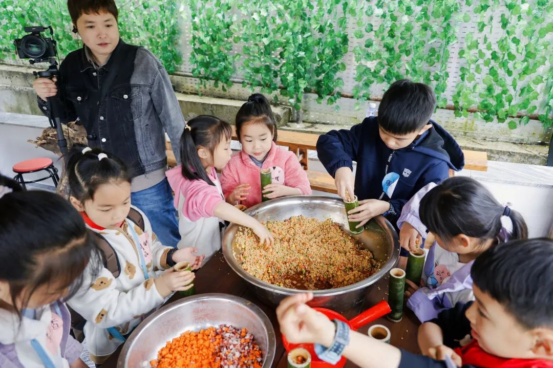 以竹为器、以笋为食,孩子们用自己的双手将刚才挖到的竹笋与蔬菜、肉类和米饭搭配,制成一份营养丰富、色香味俱全的竹筒饭。