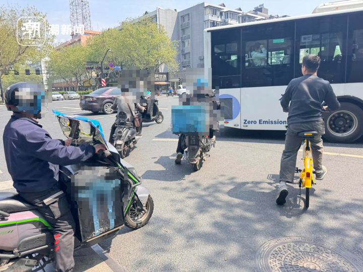 4月11日中午12时左右,潮新闻记者来到杭州拱墅区滨河广场,这里聚集了数十家餐饮店,路边有几十辆外卖电动车停在那里,不少外卖小哥提着外卖订单来来往往,在骑车离开时,不少骑手为了方便选择逆行。