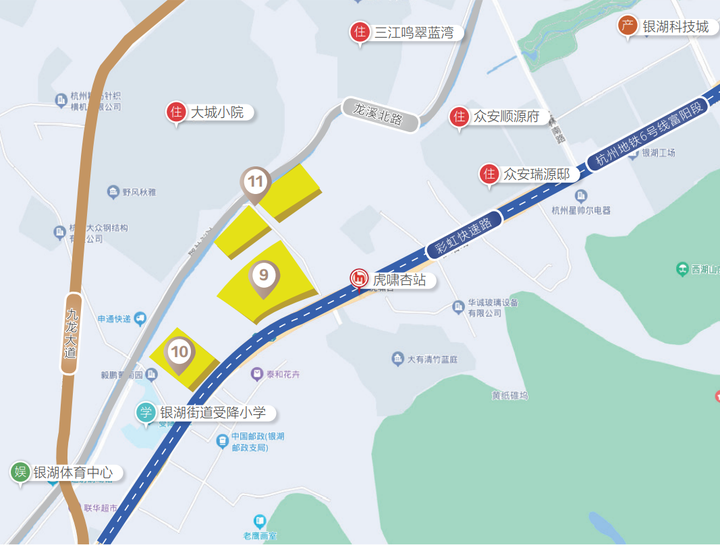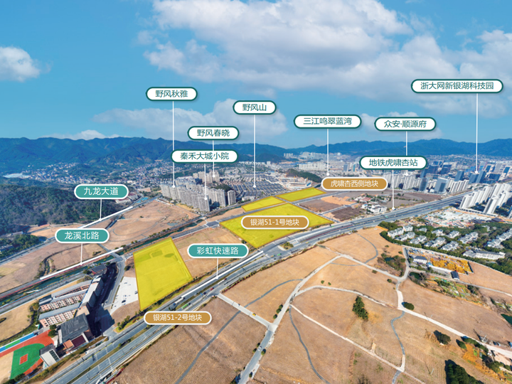 银湖51-1号地块,沿彩虹快速路北侧分布,临近近地铁6号线虎啸杏站,交通便捷。北侧为三江鸣翠蓝湾、颐景山庄等大片成熟的低密居住区,西邻受降小学,西南侧约 600 米为亚运新建场馆富阳银湖体育中心,配套成熟。