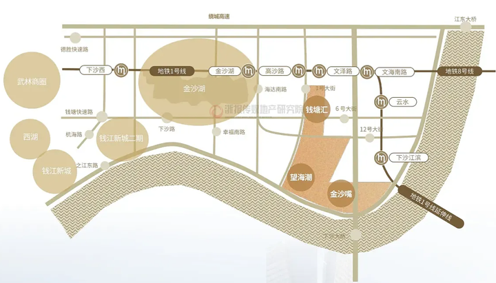 东部湾新城的启动引擎则是钱塘汇、望海潮和金沙嘴组成的三个核心区块。其中的“金沙嘴”,将重点招引总部企业,打造“超级总部中心”。这宗新挂牌的1.01容积率沿江宅地,就位于“金沙嘴”。