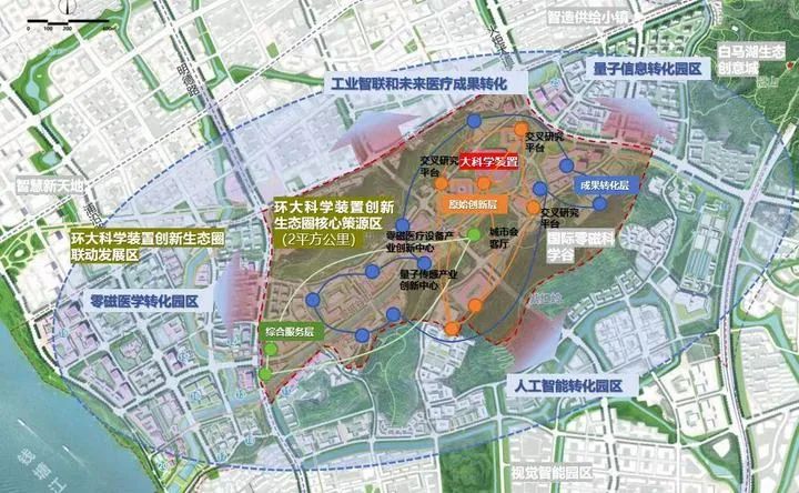 环大科学装置创新生态圈以国际零磁科学谷为核心策源区,主攻“0-1”基础研究和“1-10”应用研究和技术开发;智慧新天地、白马湖生态创意城、智造供给小镇、滨萧特别合作园视觉智能园区等环绕区域为联动发展区,推动“10-N”的成果产业化应用,建设零磁医学、量子信息、人工智能三大转化园区,着力构建“科学·技术·产业”创新生态新面貌。