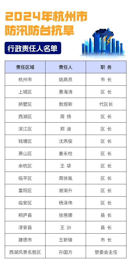 杭州应急管理消息 为加强2024年防汛防台工作的组织领导,切实落实防汛防台职责,进一步做好今年防汛防台工作,根据《中华人民共和国防洪法》《中华人民共和国防汛条例》和《浙江省防汛防台抗旱条例》《浙江省基层防汛防台体系管理暂行办法》等有关规定,现将全市2024年度防汛行政责任人和包保责任人名单予以公布。公示相关责任人防汛责任期自2024年4月15日至2025年4月15日,期间如遇人事调整,继任者自动转为责任人。