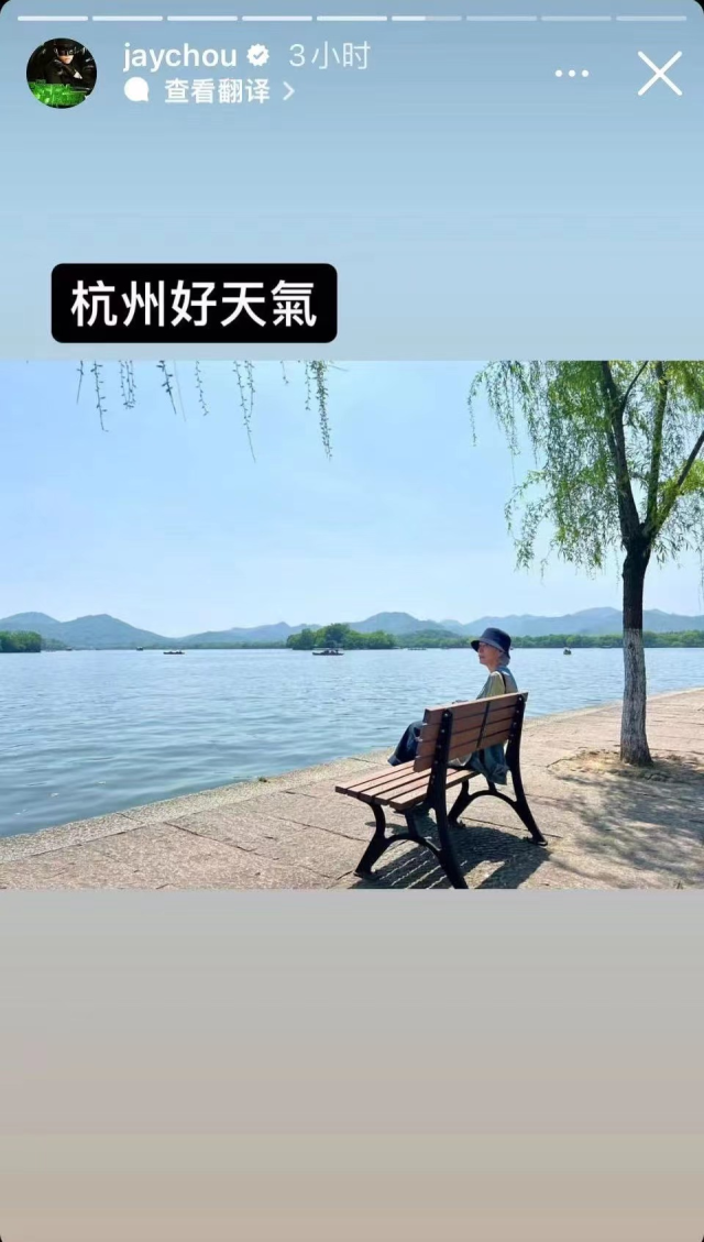 晒出了一张西湖边的照片