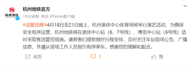 4月18日至21日晚上,杭州奥体中心体育场将举行演艺活动,为确保安全有序运营,杭州地铁将在奥体中心站(6、7号线)、博览中心站(6号线)适时采取客流管控措施。请乘客们提前做好行程安排,及时关注车站现场公告、广播信息,并遵从现场工作人员指引有序乘车。感谢您的理解和配合。